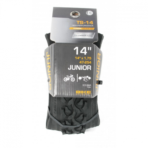 Le pneu Junior 14''X1.75 de Bike Original est un modèle à tringles souples résistant et performant avec une bande de roulement dotée de crampons pour rouler sur les chemins.