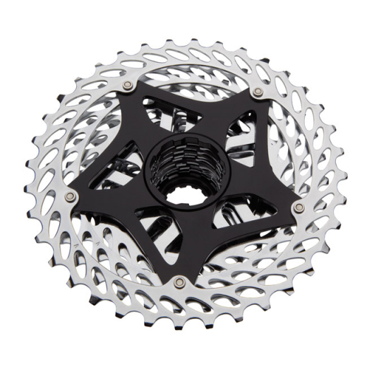 Cette cassette SRAM pèse moins de 300 grammes grâce à une étoile en aluminium et à des pignons en acier évidés.